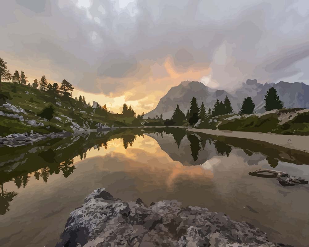 Dann sind unsere Malen nach Zahlen Sets genau das richtige für Dich! Lasse Deinen Gedanken freien Lauf und tauche ein in die vielfältige Welt der bunten Farben! Unser Motiv "Malen nach Zahlen - Spiegelung im Bergsee" wird auch Dich künstlerisch bereichern und Dein Zuhause verschönern.