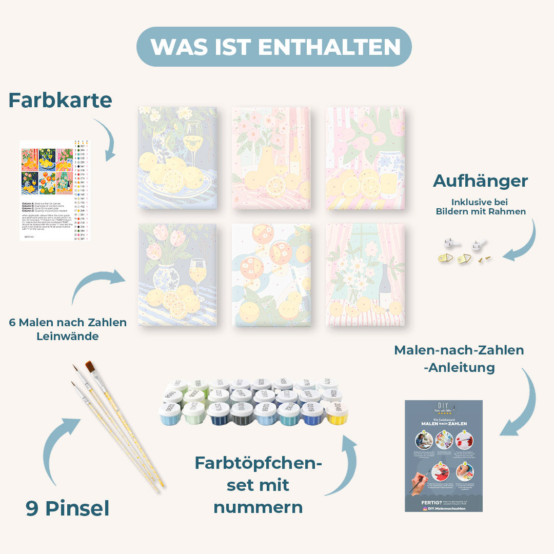 Malen nach Zahlen – 6 Mini Gemälde | Blumen & Getränke Set Malen nach zahlen