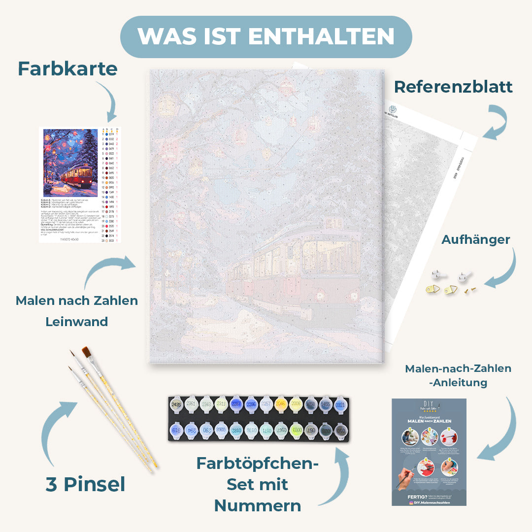 Dann sind unsere Malen nach Zahlen Sets genau das richtige für Dich! Lasse Deinen Gedanken freien Lauf und tauche ein in die vielfältige Welt der bunten Farben! Unser Motiv "Malen nach Zahlen - Verschneite Straßenbahn" wird auch Dich künstlerisch bereichern und Dein Zuhause verschönern.