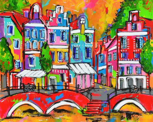 Fröhliche Malerei - Brücke mit Häusern