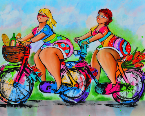 Fröhliche Malerei - Dicke Damen auf dem Fahrrad
