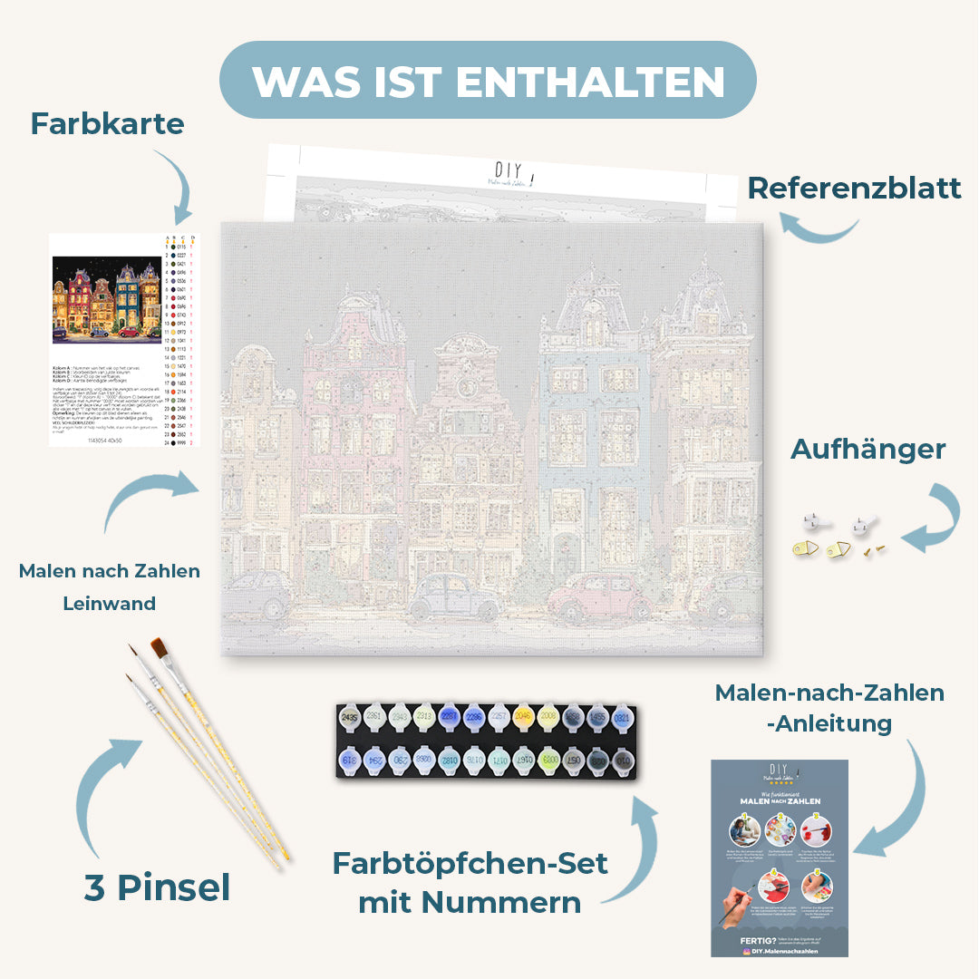 Unser "Malen nach Zahlen - Heiligabend in Amsterdam" Motiv lädt Dich auf eine kreative Entdeckungsreise ein. Du kannst Dich in aller Ruhe entspannen und den Malprozess genießen – wir liefern Dir alle passenden Malutensilien in einem rundum-sorglos DIY Set, sodass Du Dich allein auf die Kunst konzentrieren kannst.