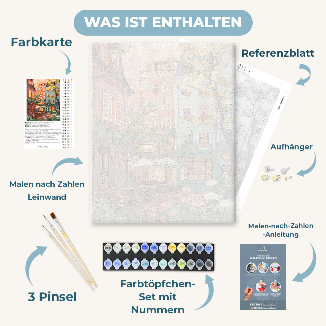 Unser "Malen nach Zahlen - Städtischer Garten" Motiv lädt Dich auf eine kreative Entdeckungsreise ein. Du kannst Dich in aller Ruhe entspannen und den Malprozess genießen – wir liefern Dir alle passenden Malutensilien in einem rundum-sorglos DIY Set, sodass Du Dich allein auf die Kunst konzentrieren kannst.