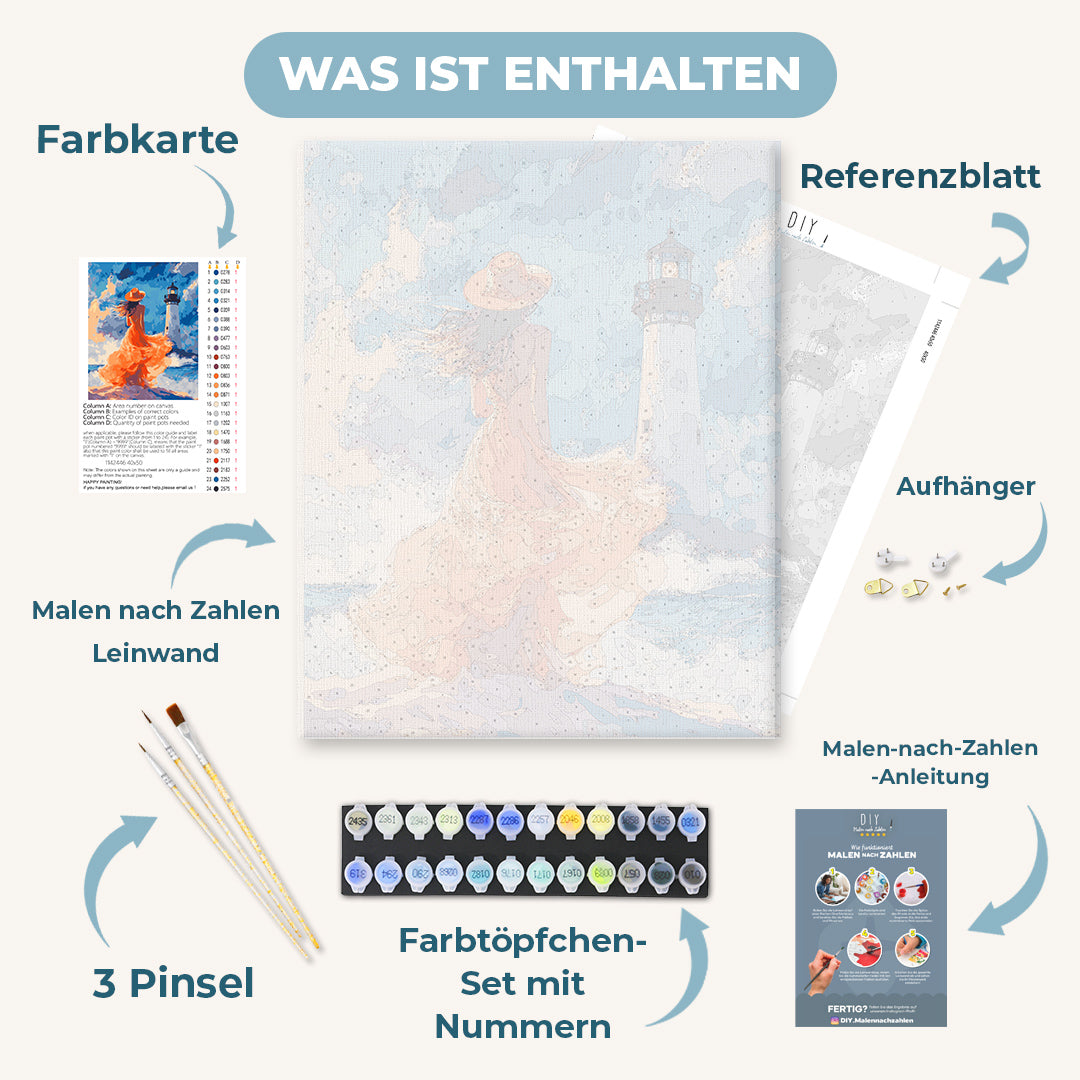 Unser "Malen nach Zahlen - Frau am Leuchtturm" Motiv lädt Dich auf eine kreative Entdeckungsreise ein. Du kannst Dich in aller Ruhe entspannen und den Malprozess genießen – wir liefern Dir alle passenden Malutensilien in einem rundum-sorglos DIY Set, sodass Du Dich allein auf die Kunst konzentrieren kannst.