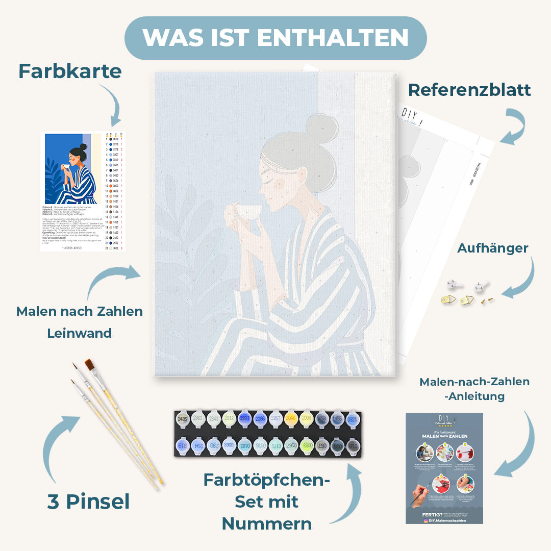 Unser "Malen nach Zahlen - Frau in Blau" Motiv lädt Dich auf eine kreative Entdeckungsreise ein. Du kannst Dich in aller Ruhe entspannen und den Malprozess genießen – wir liefern Dir alle passenden Malutensilien in einem rundum-sorglos DIY Set, sodass Du Dich allein auf die Kunst konzentrieren kannst.
