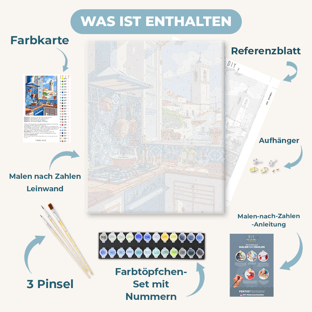 Unser "Malen nach Zahlen - Blaue Küche" Motiv lädt Dich auf eine kreative Entdeckungsreise ein. Du kannst Dich in aller Ruhe entspannen und den Malprozess genießen – wir liefern Dir alle passenden Malutensilien in einem rundum-sorglos DIY Set, sodass Du Dich allein auf die Kunst konzentrieren kannst.