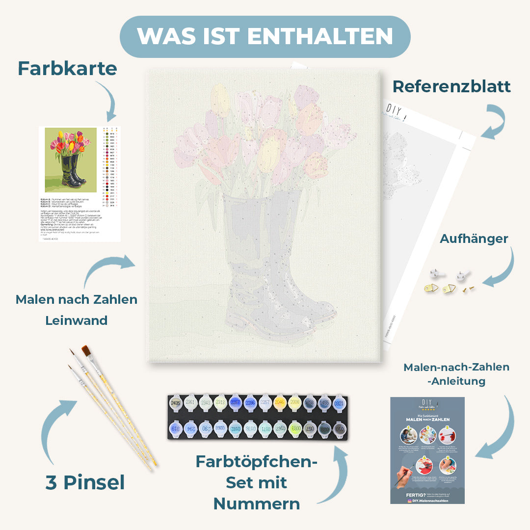 Unser "Malen nach Zahlen - Blumenschritte" Motiv lädt Dich auf eine kreative Entdeckungsreise ein. Du kannst Dich in aller Ruhe entspannen und den Malprozess genießen – wir liefern Dir alle passenden Malutensilien in einem rundum-sorglos DIY Set, sodass Du Dich allein auf die Kunst konzentrieren kannst.