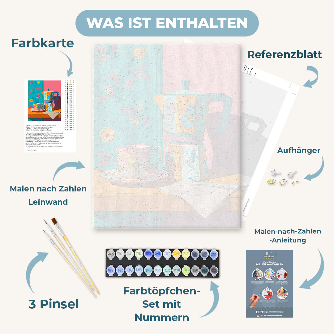 Unser "Malen nach Zahlen - Café à la Couleur" Motiv lädt Dich auf eine kreative Entdeckungsreise ein. Du kannst Dich in aller Ruhe entspannen und den Malprozess genießen – wir liefern Dir alle passenden Malutensilien in einem rundum-sorglos DIY Set, sodass Du Dich allein auf die Kunst konzentrieren kannst.