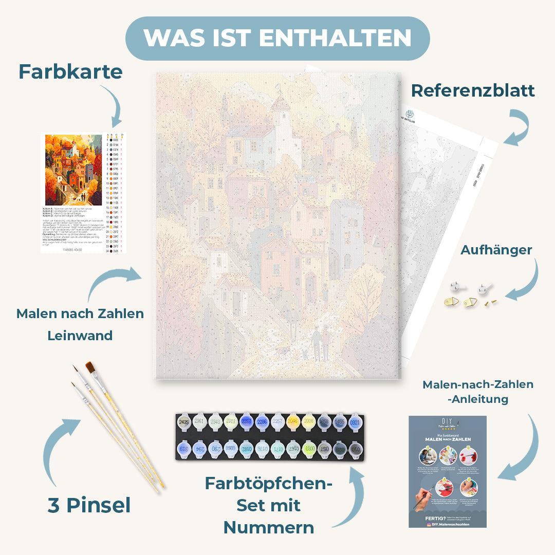 Unser "Malen nach Zahlen - Charmantes Herbstdorf" Motiv lädt Dich auf eine kreative Entdeckungsreise ein. Du kannst Dich in aller Ruhe entspannen und den Malprozess genießen – wir liefern Dir alle passenden Malutensilien in einem rundum-sorglos DIY Set, sodass Du Dich allein auf die Kunst konzentrieren kannst.