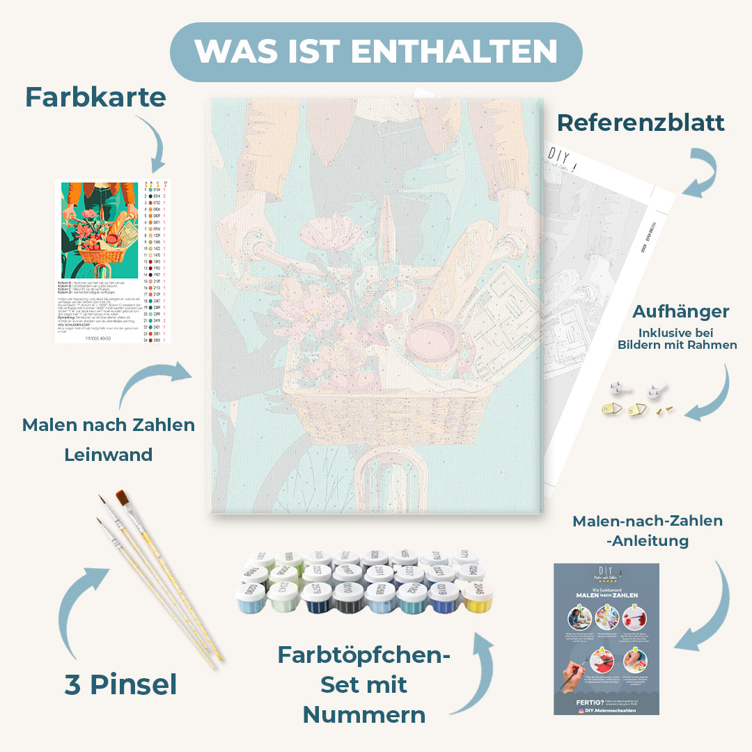 Unser "Malen nach Zahlen - Ein Morgenkorb" Motiv lädt Dich auf eine kreative Entdeckungsreise ein. Du kannst Dich in aller Ruhe entspannen und den Malprozess genießen – wir liefern Dir alle passenden Malutensilien in einem rundum-sorglos DIY Set, sodass Du Dich allein auf die Kunst konzentrieren kannst.