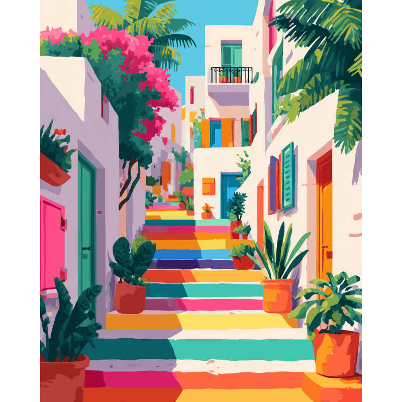 Dann sind unsere Malen nach Zahlen Sets genau das richtige für Dich! Lasse Deinen Gedanken freien Lauf und tauche ein in die vielfältige Welt der bunten Farben! Unser Motiv "Eine Regenbogentreppe" wird auch Dich künstlerisch bereichern und Dein Zuhause verschönern.
