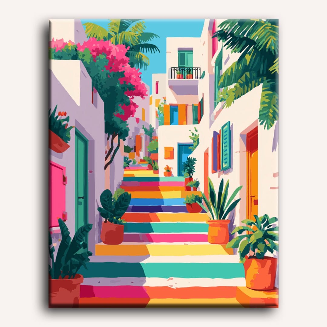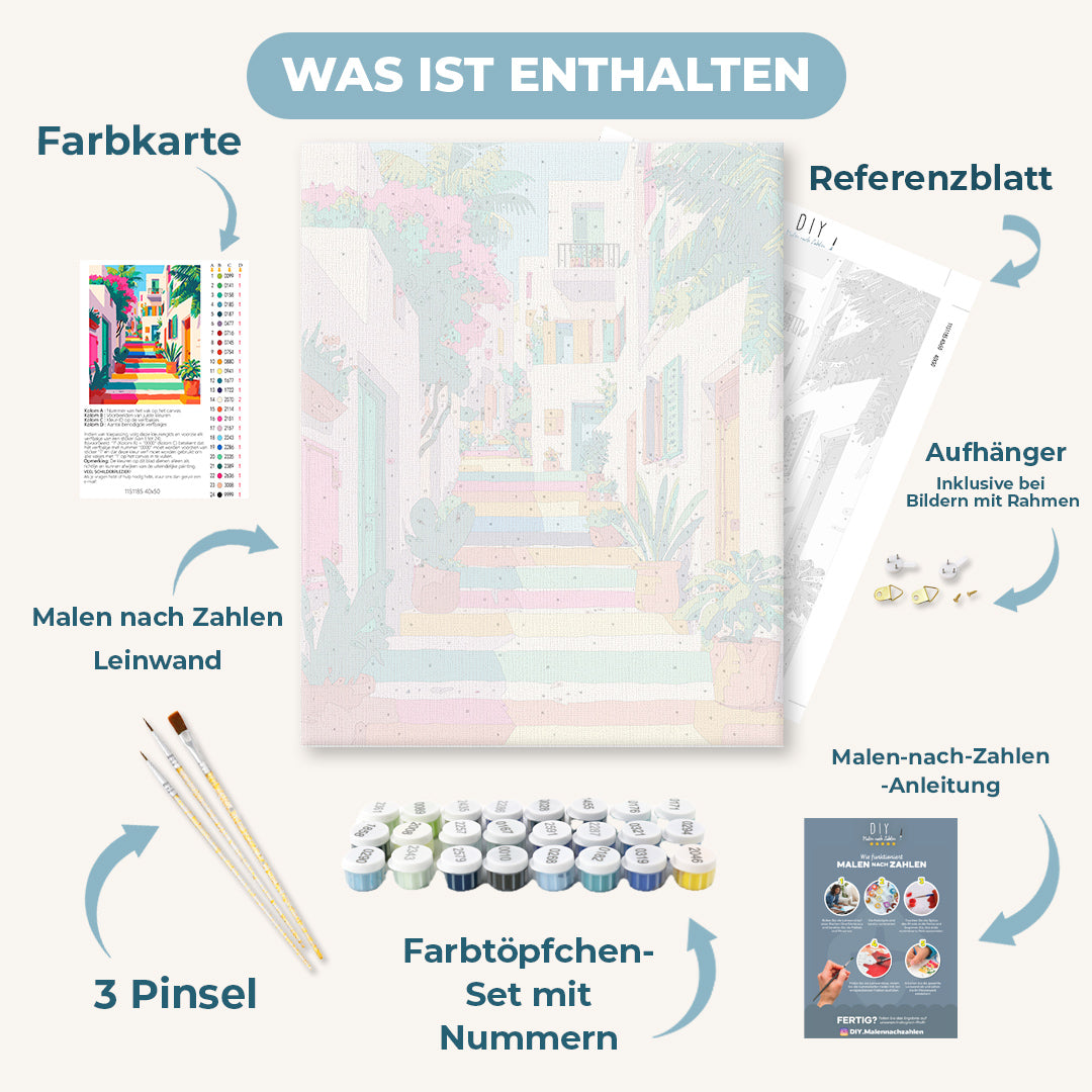 Unser "Malen nach Zahlen - Eine Regenbogentreppe" Motiv lädt Dich auf eine kreative Entdeckungsreise ein. Du kannst Dich in aller Ruhe entspannen und den Malprozess genießen – wir liefern Dir alle passenden Malutensilien in einem rundum-sorglos DIY Set, sodass Du Dich allein auf die Kunst konzentrieren kannst.