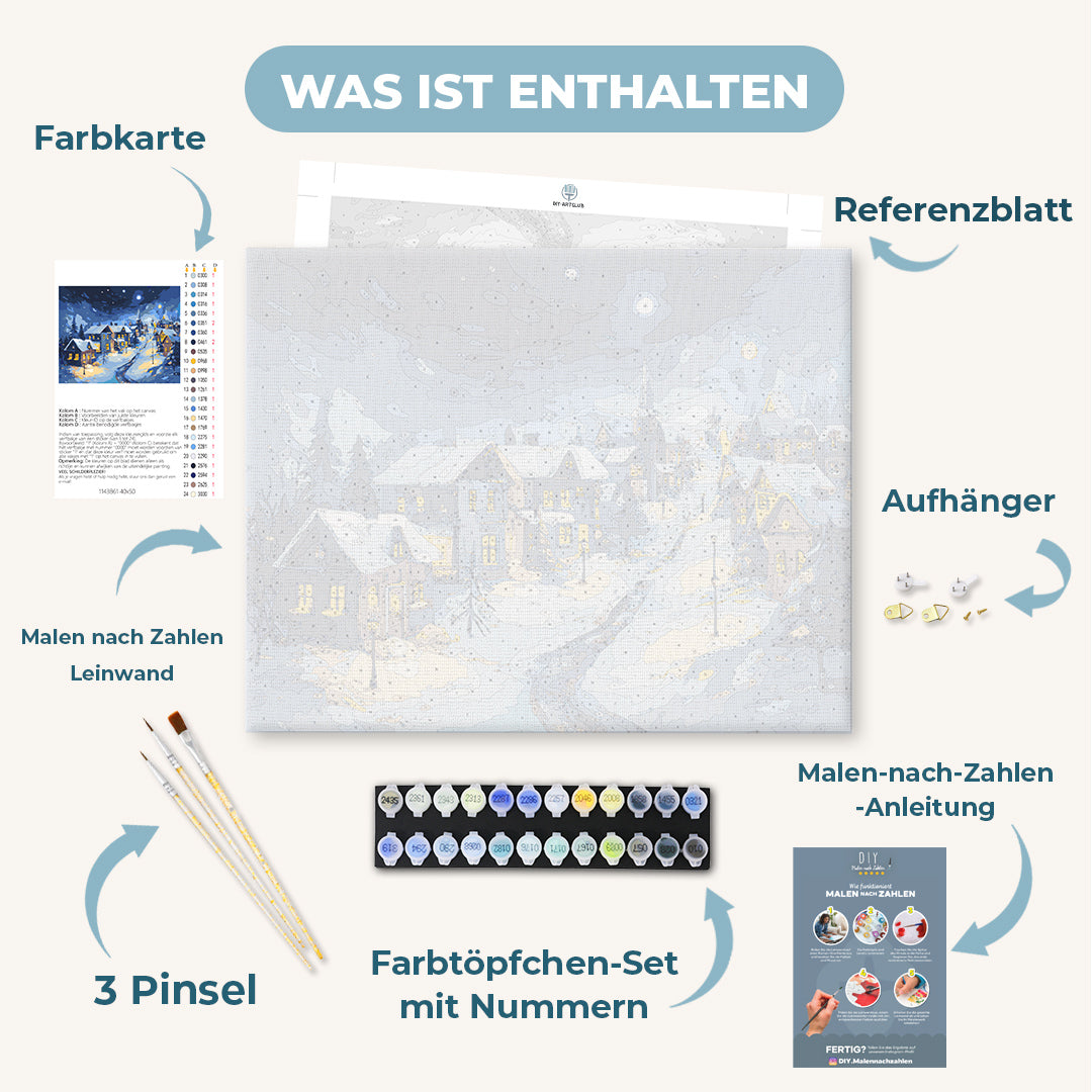 Unser "Malen nach Zahlen - Friedliches Winterdorf" Motiv lädt Dich auf eine kreative Entdeckungsreise ein. Du kannst Dich in aller Ruhe entspannen und den Malprozess genießen – wir liefern Dir alle passenden Malutensilien in einem rundum-sorglos DIY Set, sodass Du Dich allein auf die Kunst konzentrieren kannst.