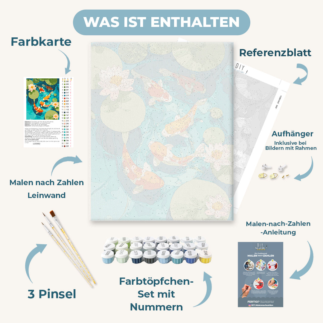Unser "Malen nach Zahlen - Koi-Teich" Motiv lädt Dich auf eine kreative Entdeckungsreise ein. Du kannst Dich in aller Ruhe entspannen und den Malprozess genießen – wir liefern Dir alle passenden Malutensilien in einem rundum-sorglos DIY Set, sodass Du Dich allein auf die Kunst konzentrieren kannst.