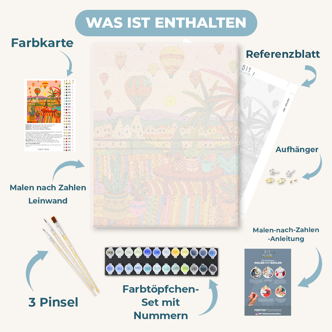 Unser "Malen nach Zahlen - Lebendiges Kappadokien" Motiv lädt Dich auf eine kreative Entdeckungsreise ein. Du kannst Dich in aller Ruhe entspannen und den Malprozess genießen – wir liefern Dir alle passenden Malutensilien in einem rundum-sorglos DIY Set, sodass Du Dich allein auf die Kunst konzentrieren kannst.