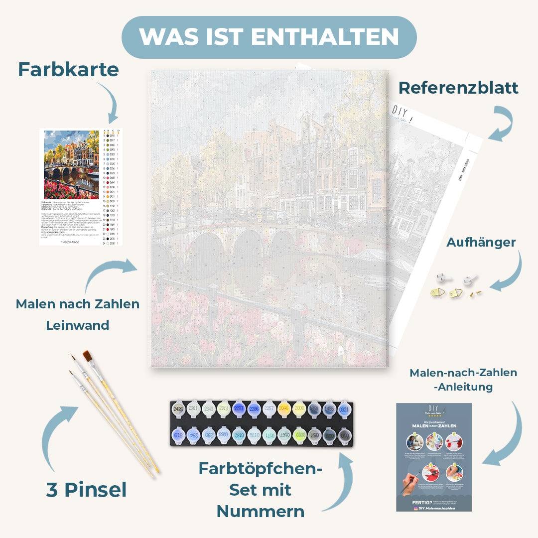 Unser "Malen nach Zahlen - Romantischer Kanal" Motiv lädt Dich auf eine kreative Entdeckungsreise ein. Du kannst Dich in aller Ruhe entspannen und den Malprozess genießen – wir liefern Dir alle passenden Malutensilien in einem rundum-sorglos DIY Set, sodass Du Dich allein auf die Kunst konzentrieren kannst.