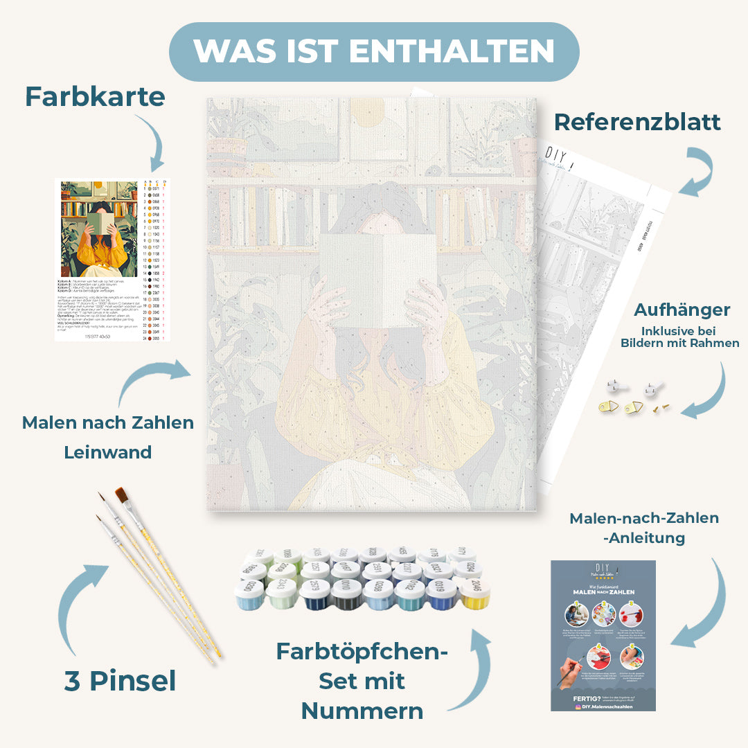 Dann sind unsere Malen nach Zahlen Sets genau das richtige für Dich! Lasse Deinen Gedanken freien Lauf und tauche ein in die vielfältige Welt der bunten Farben! Unser Motiv "Versteckt zwischen den Seiten" wird auch Dich künstlerisch bereichern und Dein Zuhause verschönern.
