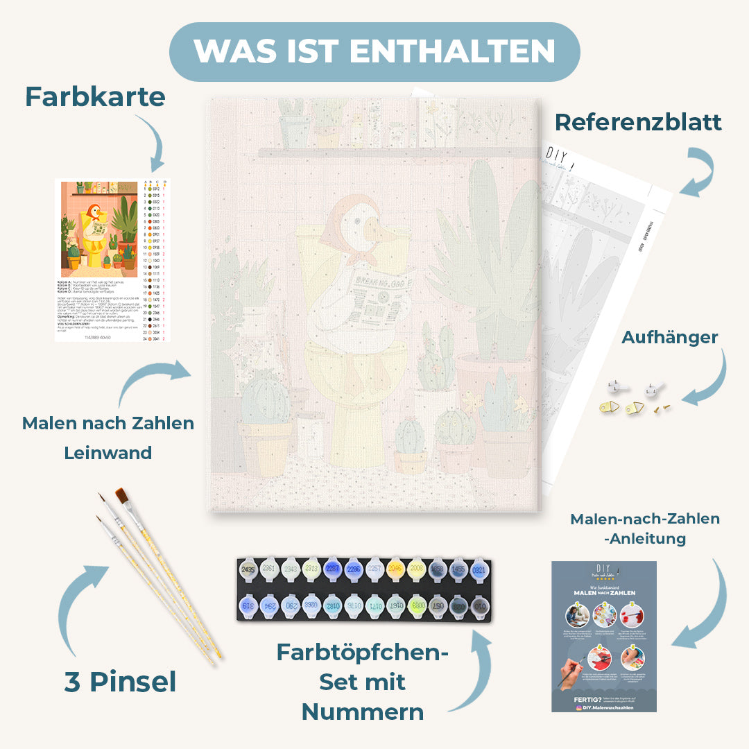 Unser "Malen nach Zahlen - Die weiße Gans auf der Toilette" Motiv lädt Dich auf eine kreative Entdeckungsreise ein. Du kannst Dich in aller Ruhe entspannen und den Malprozess genießen – wir liefern Dir alle passenden Malutensilien in einem rundum-sorglos DIY Set, sodass Du Dich allein auf die Kunst konzentrieren kannst.