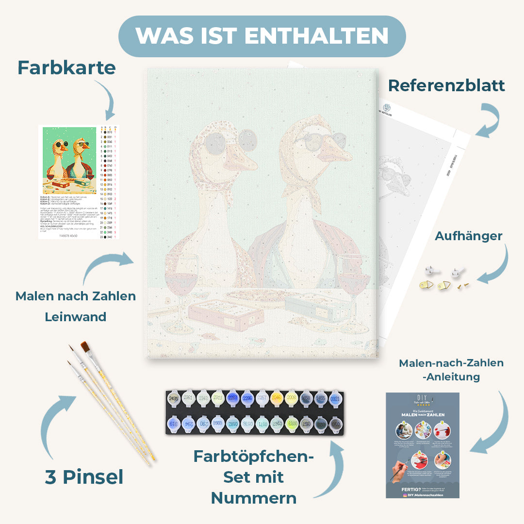 Unser "Malen nach Zahlen - Gänse-Gossip" Motiv lädt Dich auf eine kreative Entdeckungsreise ein. Du kannst Dich in aller Ruhe entspannen und den Malprozess genießen – wir liefern Dir alle passenden Malutensilien in einem rundum-sorglos DIY Set, sodass Du Dich allein auf die Kunst konzentrieren kannst.