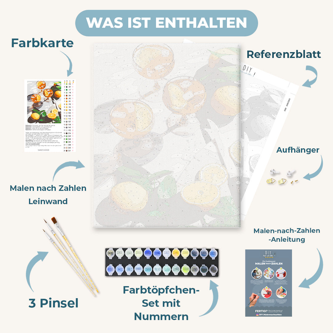 Unser "Malen nach Zahlen - Orange Summerdrinks" Motiv lädt Dich auf eine kreative Entdeckungsreise ein. Du kannst Dich in aller Ruhe entspannen und den Malprozess genießen – wir liefern Dir alle passenden Malutensilien in einem rundum-sorglos DIY Set, sodass Du Dich allein auf die Kunst konzentrieren kannst.
