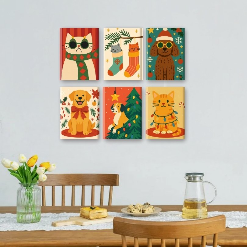 6 Mini-Gemälde | Katzen und Hunde Weihnachts Set