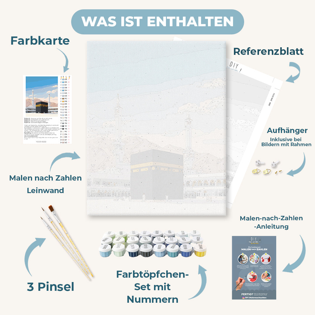 Unser "Malen nach Zahlen - Heilige Kaaba" Motiv lädt Dich auf eine kreative Entdeckungsreise ein. Du kannst Dich in aller Ruhe entspannen und den Malprozess genießen – wir liefern Dir alle passenden Malutensilien in einem rundum-sorglos DIY Set, sodass Du Dich allein auf die Kunst konzentrieren kannst.